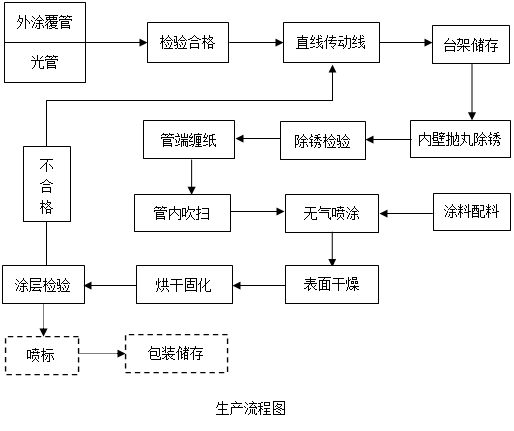 1、3PE生產(chǎn)線進(jìn)管 2、進(jìn)管臺(tái)架 3、直線輸送輥道 4、除塵器 5、內(nèi)噴涂進(jìn)管臺(tái)架 6、鋼管內(nèi)壁除銹設(shè)備 7、過(guò)渡臺(tái)架 8、鋼管內(nèi)壁噴涂設(shè)備 9、內(nèi)噴涂出管臺(tái)架 10、直線輸送輥道 11、涂層固化室 12、成品管出管臺(tái)架