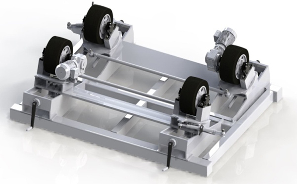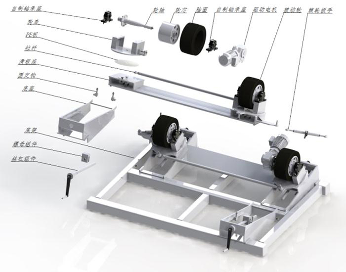 雙輪胎式輸送輥道常用結(jié)構(gòu)為滑板式和孔距調(diào)整式,滑板式螺旋輥道具有管底高不變,輪距無(wú)級(jí)調(diào)整,集成裝配,便于安裝;滑板式螺旋輥道傳動(dòng)輪角度采用棘輪調(diào)節(jié);兩輪胎包角大于60度,輪組間用拉桿相連,拉桿可調(diào)節(jié),端部采用桿端關(guān)節(jié)軸承連接,保證輪胎角度調(diào)整的簡(jiǎn)便性及統(tǒng)一性,確保傳動(dòng)線的運(yùn)行平穩(wěn);輪胎底座下兩配合面之間配1~2mm聚四氟夾層,調(diào)整輪間距時(shí)簡(jiǎn)捷省力;調(diào)節(jié)精度在調(diào)節(jié)輪組處均配裝刻度尺,以便于觀察。傳動(dòng)線在調(diào)整完畢后,用鎖緊裝置將傳動(dòng)線鎖緊。并保證調(diào)節(jié)裝置能夠取下移出。